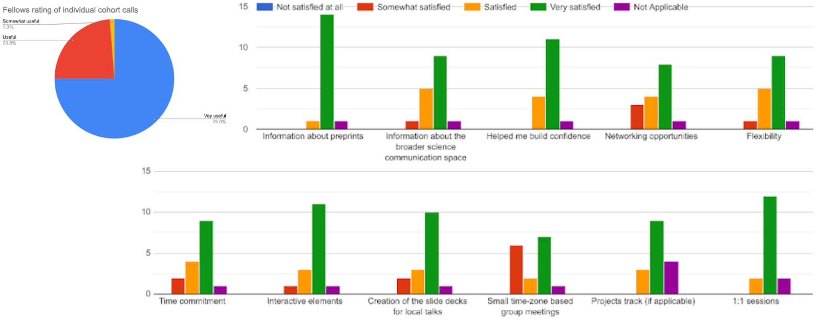 Respondents were highly satisfied with the program with 73% rating the program 5/5 and the remainder rating it 4/5. Respondents also stated that the program had met their expectations with 69% rating 5/5 and 31% rating 4/5. Individual Fellows scored the individual cohort calls as very useful in 75% of responses and useful in 23%. Only one Fellow scored a single session as “somewhat useful”. Fellows particularly rated the “information about preprints”, “interactive elements” and “1:1 sessions” as “very satisfied”. The least satisfactory element were the “networking opportunities” and “small group meetings,” which we intend to address with some program revisions in 2025.