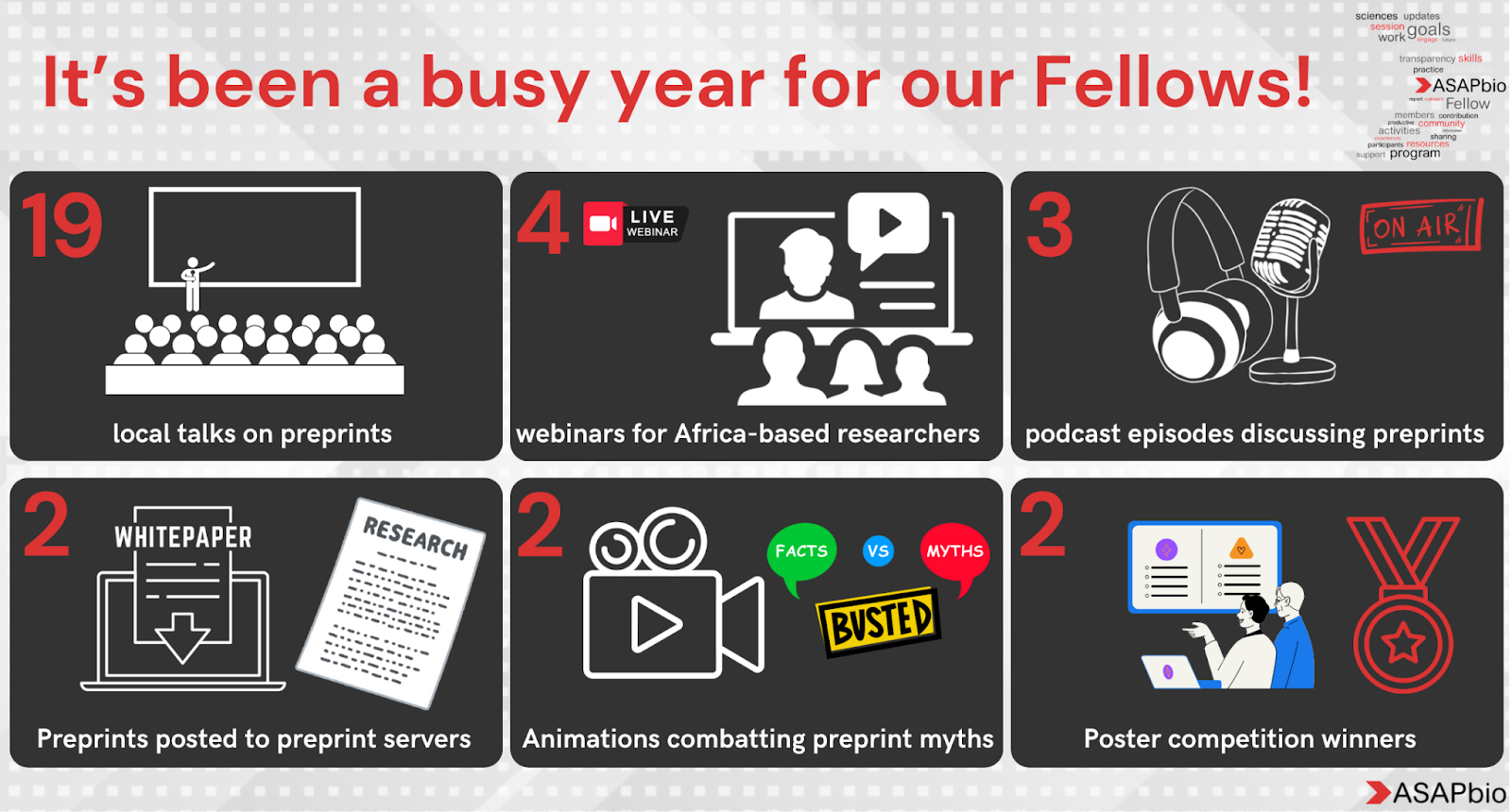 This year, the Fellows engaged in 7 projects relating to preprints. Collectively, the Fellows have produced: 2 preprints, 2 podcast episodes, a 4-part webinar series on preprints in Africa, a poster competition, and 2 scripts for YouTube videos. That’s in addition to the 19 slide decks created as part of the Culture & Community track. It’s been an exceptionally productive year!