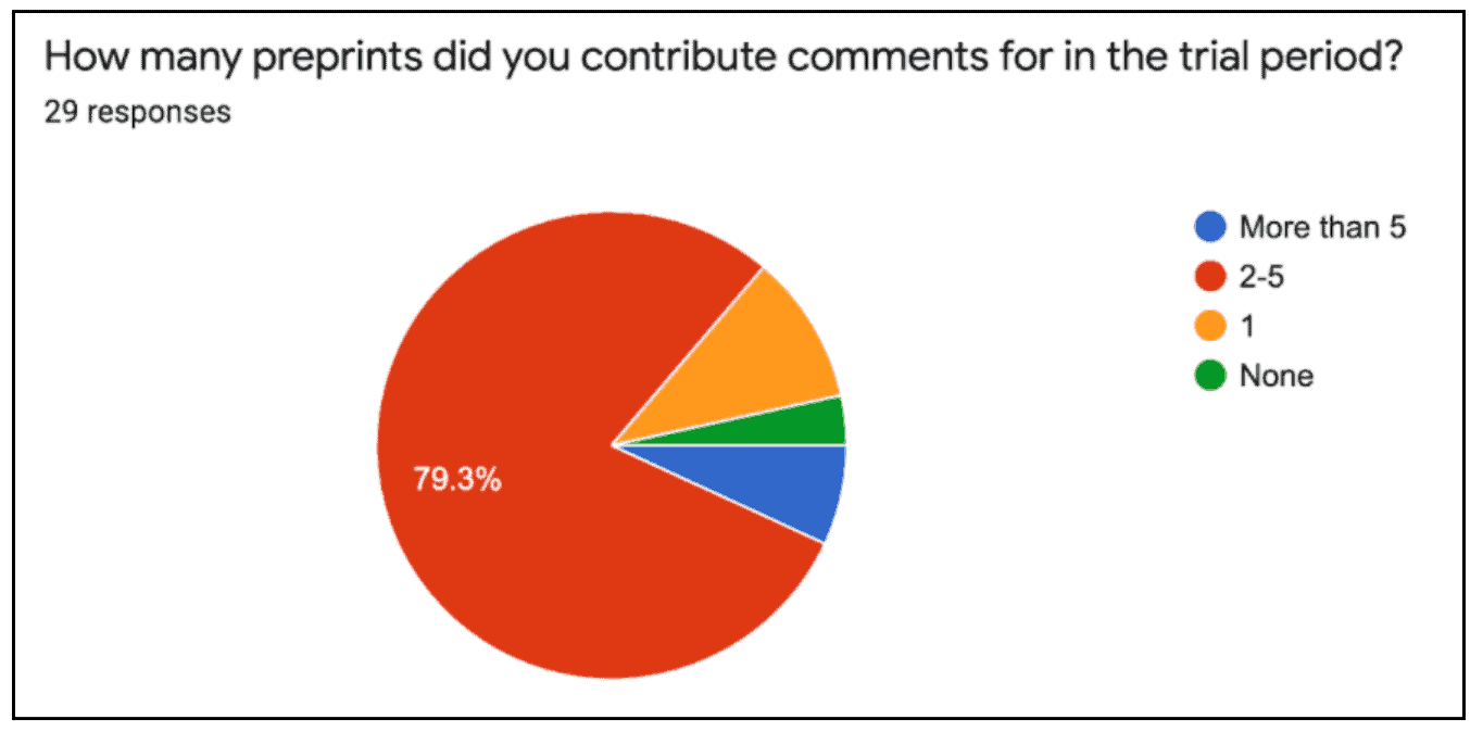 We also surveyed the crowd reviewers to learn about their views on the trial, and we received 29 responses. 25 of the respondents rated the experience in the trial as positive or very positive, and a majority (26) indicated they would be interested in participating in this type of activity in the future. 86% of respondents had provided comments on two or more preprints, which shows a good level of engagement with the commenting activities.