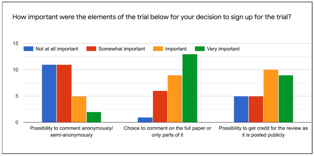 The reviewers valued the possibility to comment on both the full paper or parts of it, and also the possibility to get credit for the reviews given these are posted publicly. In additional comments, several respondents indicated that they felt the crowd review approach required less time commitment than a journal review and appreciated that this format did not involve questions on whether the paper was a fit for a particular journal.