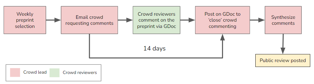 Each of the crowd will be led by ASAPbio Fellows, who will circulate preprints for input by a group of researchers interested in contributing feedback (‘the crowd’). Each crowd will review a new preprint every two weeks. Preprints will be circulated to the group; crowd members can then comment on the full paper or parts of the study. Commenting will take place via a private collaborative Google document. After the 14-day commenting period, the leads will create a synthesis of the comments for public posting on PREreview; this will also be added to Sciety, the aggregator of preprint evaluations. You can read more about crowd preprint review and how we will interact with crowd reviewers at asapbio.org/crowd-preprint-review.