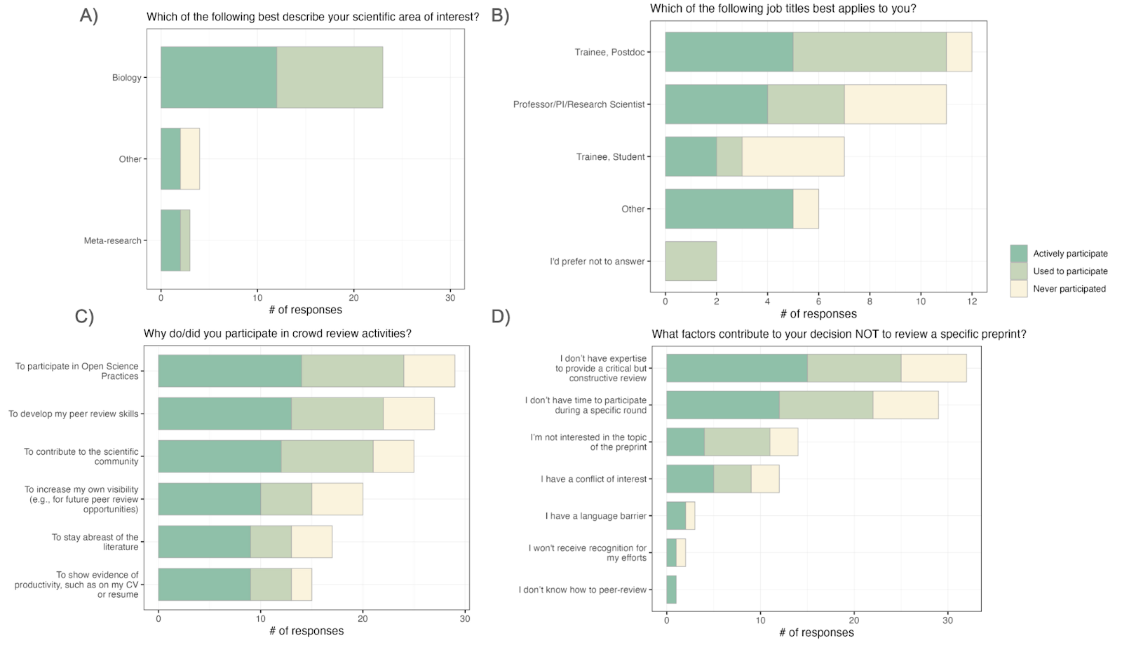 Figure 2. A preview of some of our findings. A) Scientific area of interest of survey respondents, B) career stage of survey respondents, C) reasons for participating in crowd preprint review and D) reasons for not reviewing a specific preprint