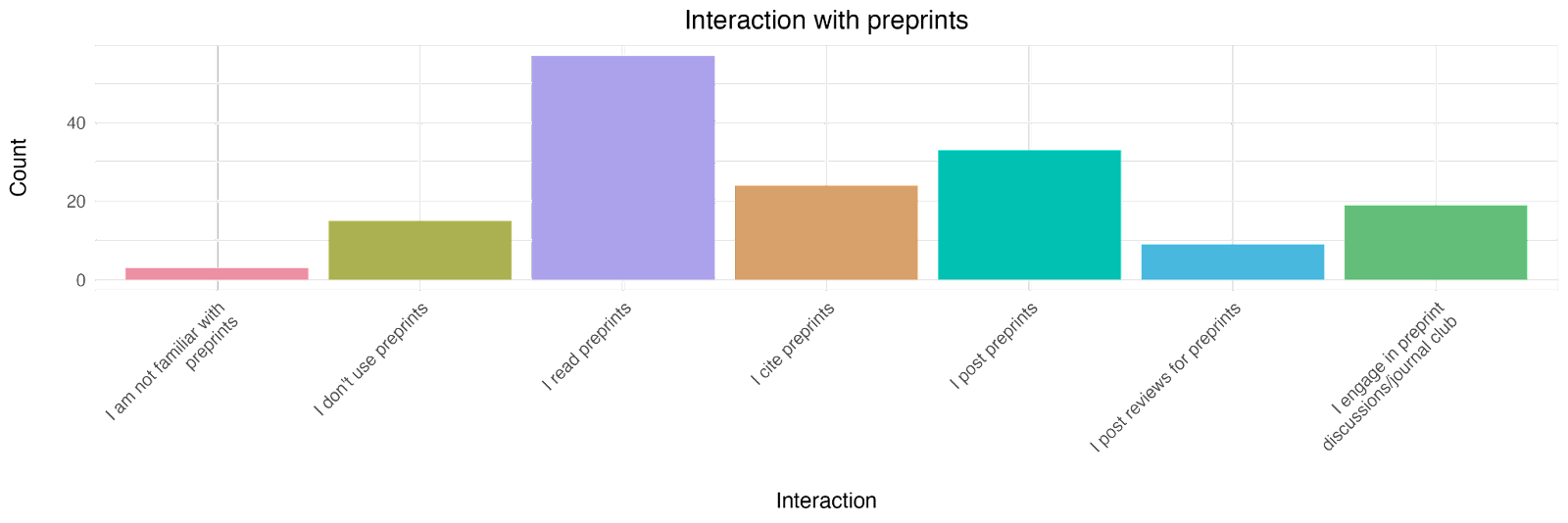 All respondents were asked about their current interaction with preprints to gauge their understanding and use of preprints more generally. The majority actively read preprints with large numbers also posting and citing preprints. Fewer respondents posted reviews for preprints, representing an area that can be improved upon. Interestingly, more did engage in preprint discussions and journal clubs, suggesting that this may be a prime target for increasing preprint reviewing. A relatively large portion of respondents did not interact, or were not familiar with preprints (Fig 2).