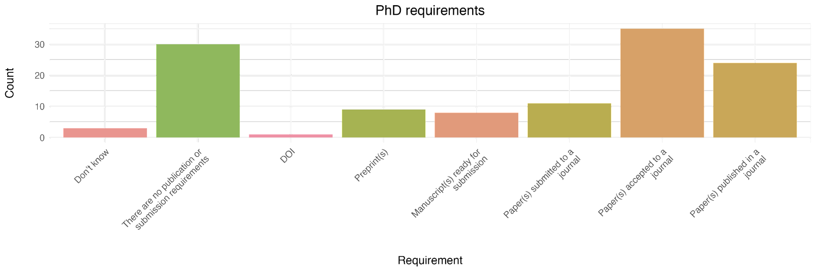 One important aspect that this survey did not capture is the difference between formal requirements and expectations. Anecdotally, it was highlighted that even in institutions with no formal requirements, individual group leaders or institutions do still enforce unofficial publication requirements. This is not communicated transparently and represents an important area for future investigation.