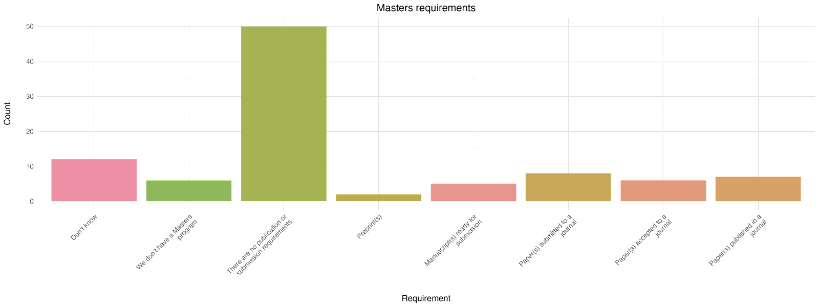 We first asked about any requirements for graduation from masters programs (Fig 3). The overwhelming majority did not have any formal graduation requirements although a number did require manuscripts to be ready, submitted, accepted or published in a journal. Very few respondents stated that preprints were accepted to graduate. A larger number of respondents either didn’t have a masters program or didn’t know the graduation requirements. Perhaps the most surprising aspect to these results are the number of institutions that require master level students to have submitted or published a journal article, especially given the generally short timeframes for such programs.