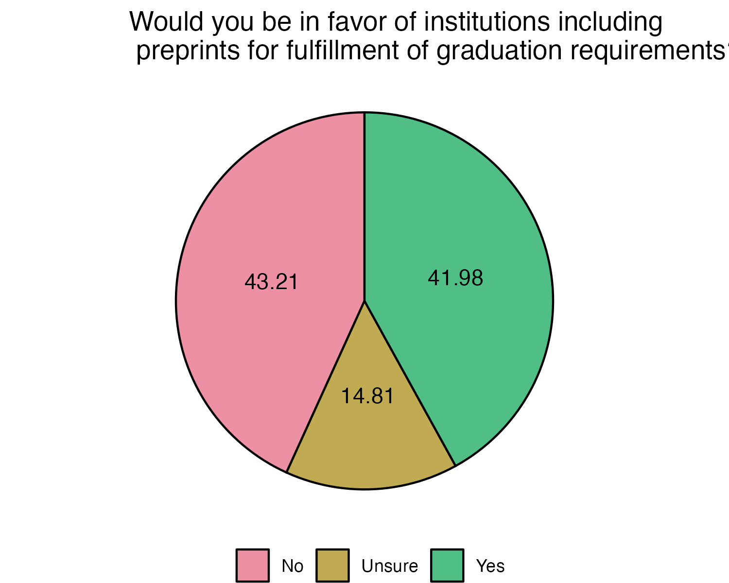Finally, we asked respondents if they would be in favor of institutions including preprints for fulfilling graduation requirements (Fig 5). The responses were relatively evenly split between favoring preprints (41%) and not favoring preprints (43%). This is perhaps due to confusion in the wording of the question as the long form responses indicated that many would prefer no formal publishing requirements. The question had been intended to ask if, where requirements exist, would it be preferred to change these to preprints or keep them as publications.