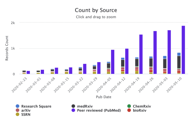 Preprints are one of the mechanisms that researchers are using to communicate their work early and broadly, and a significant fraction of COVID-19 research is currently available via preprints. As of 19 May 2020, 32% of the COVID-19 papers listed on the NIH’s OPA COVID-19 portfolio are preprints, by comparison, the proportion of biomedical preprints vs the published literature in PubMed stood at 3% in 2019 (source for 2019 here, current data here).