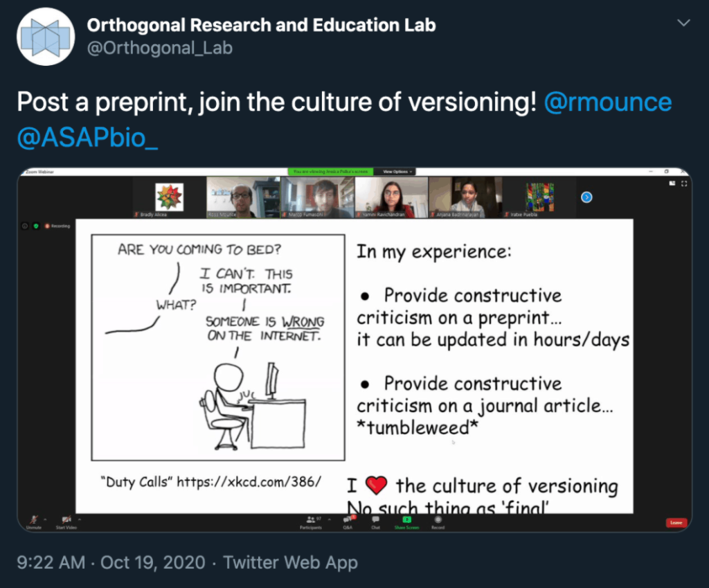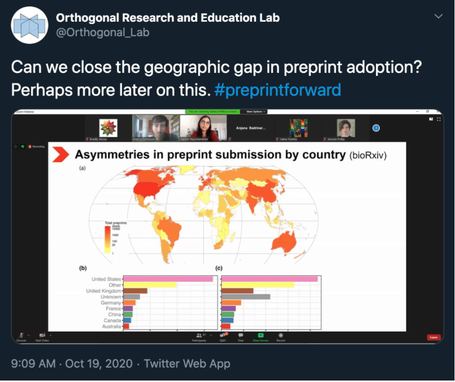 Fittingly, “Past, Present, and Future of Preprints” was scheduled for the first day (October 19) of Open Access Week 2020. The event was live-tweeted from the Orthogonal Research and Education Lab Twitter account. Yamini Ravichandran and Marco Fumasoni started us off with a short introductory presentation, followed by a short introduction from each of our participants: Antonis Rokas, Soumya Swaminathan, Richard Sever, Ross Mounce, and Anjana Badrinarayan. This part of the session culminated with Marco posing an initial question to the panel: Can we close the geographic gap in preprint adoption?