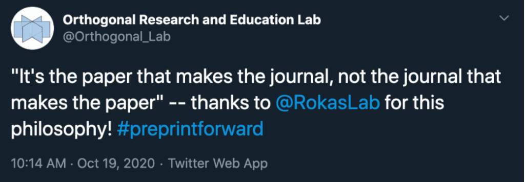 There was also a discussion of the role traditional journals play in the research dissemination process. One future direction of preprint culture is to decouple papers from journals. Towards the end of our session, we heard a choice quote from Antonis Rokas and the Rokas Lab.