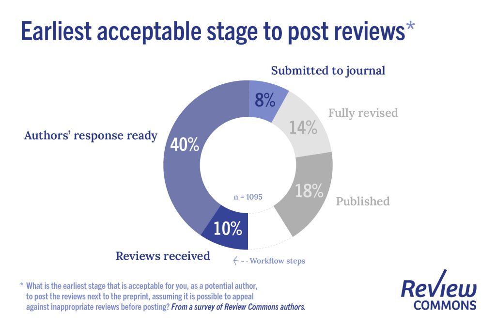 In a recent survey, Review Commons’ authors were asked the question: “What is the earliest stage that would be acceptable to post the reviews?”. The results (1,095 respondents) show that many authors feel it is acceptable to post the reviews as soon as the refereed preprint can be transferred to a journal (see figure, below). The data also reveals that the ability to formulate a response to the reviewers is a critical consideration. These results guided the new Review Commons policy that leaves sufficient time for authors to prepare a thoughtful response, which is then posted together with the review when the refereed preprint is transferred to an affiliate journal for consideration.