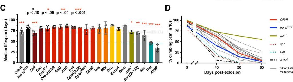Our lab generated the first systematic loss-of-function mutations for AMPs in an animal model: Drosophila fruit flies. Using those special flies, we could ask what each AMP gene was doing individually, or in systematic combinations where we deleted one, two, three… all the way up to 14 genes simultaneously. We then checked the aging of those flies to see if deleting AMPs helped them live longer, which is what you’d predict given the “AMPs damage the host” model. But if anything we saw the opposite: flies lacking individual AMPs were fine, so it’s not like any one gene was making a difference. And flies lacking multiple genes never lived better than normal flies, while certain combinations actually did worse (including flies lacking 14 AMP genes simultaneously).