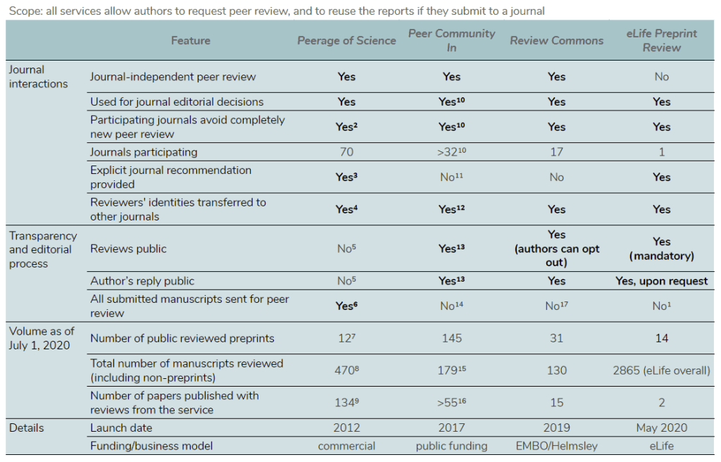 Learn more about the different modalities, and how they compare and differ at our blog post about the four services provided by eLife‘s Preprint Review, Peerage of Science, Peer Community In and Review Commons of EMBO and ASAPbio.