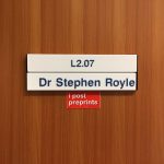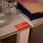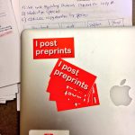 There are probably researchers in your department who aren’t aware that someone they know has posted a preprint. You can spark conversations around your lab or at conferences by affixing a sticker to your laptop, water bottle, or office door. See examples below for inspiration.