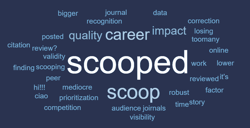 If you’d like to see some anecdata, here’s a word cloud generated by digitally polling the audience at the 2016 EMBO Long Term (postdoctoral) Fellowship retreat in November, 2016 (39 devices responded). The prompt was, “What is your biggest concern about preprints?”