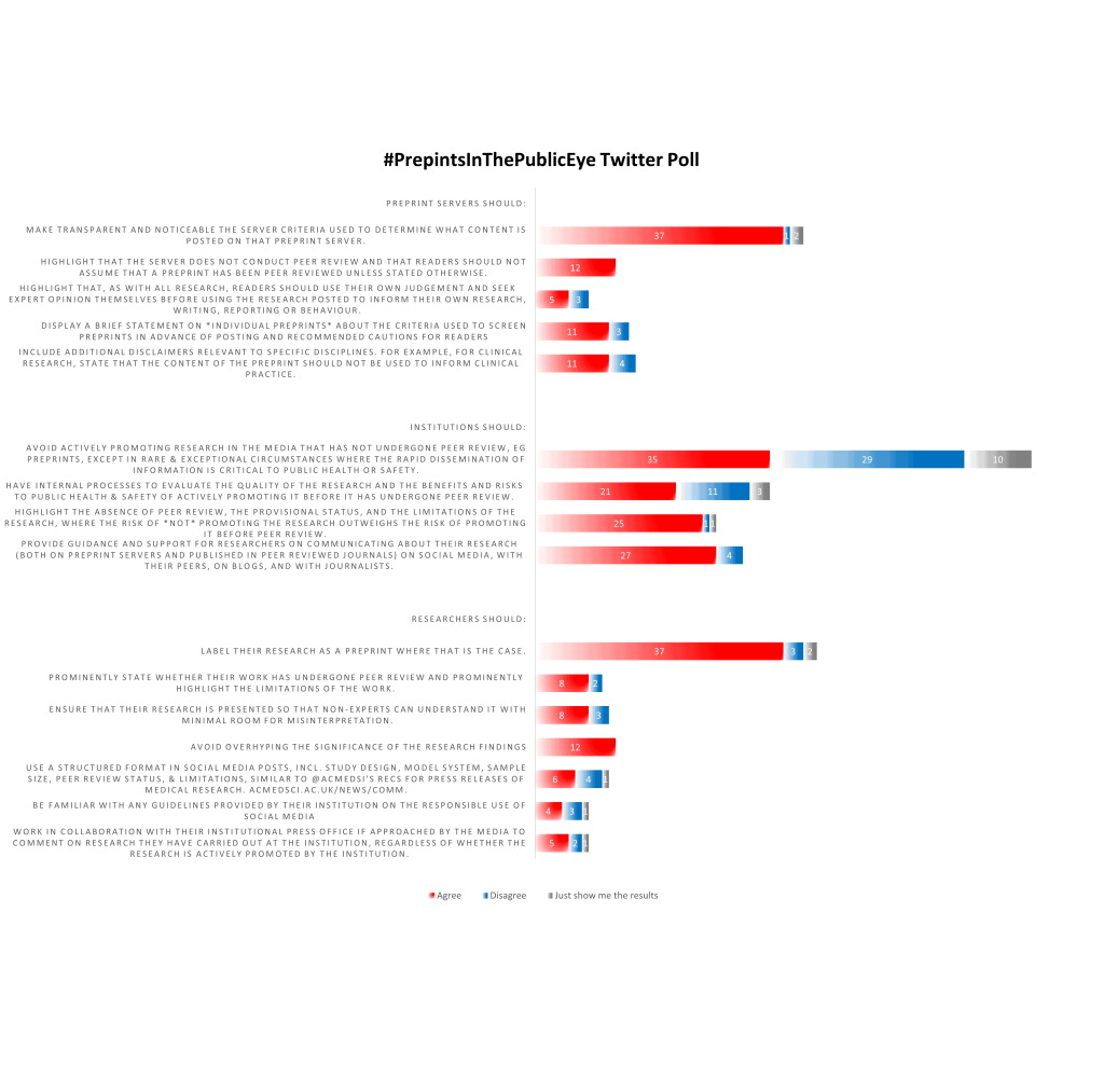 While in no way scientific, the polls show a majority agreement with most of the guiding principles for preprint servers, institutions and researchers. The most obvious area of contention seems to be whether, “Institutions should actively avoid promoting research in the media that has not undergone peer review, eg, preprints, except in rare and exceptional circumstances where the rapid dissemination of information is critical to public health or safety.”