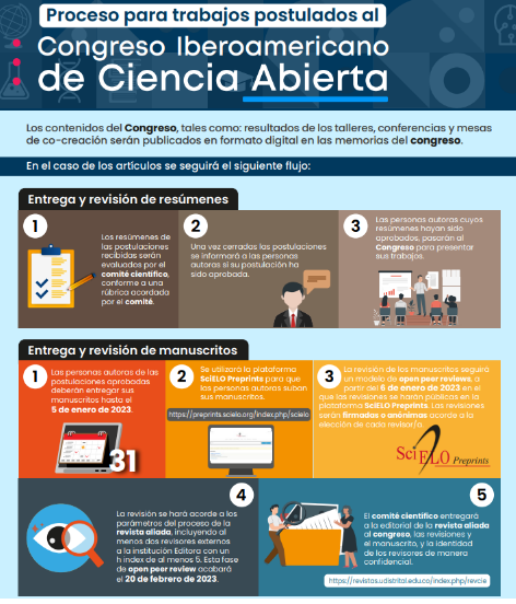 The first Iberoamerican Congress for Open Science could not be indifferent to this open communication approach for early, accelerated publication. With that in mind, we decided to implement open and collaborative processes for the papers that authors intended to publish as part of the congress proceedings. Instead of pursuing the fantasy of high impact factors or mainstream journals, we looked for authors who had a desire to share their experiences, their efforts to make science transparent, inclusive, multilingual and reproducible, and publish in a regional quality open-access journal.