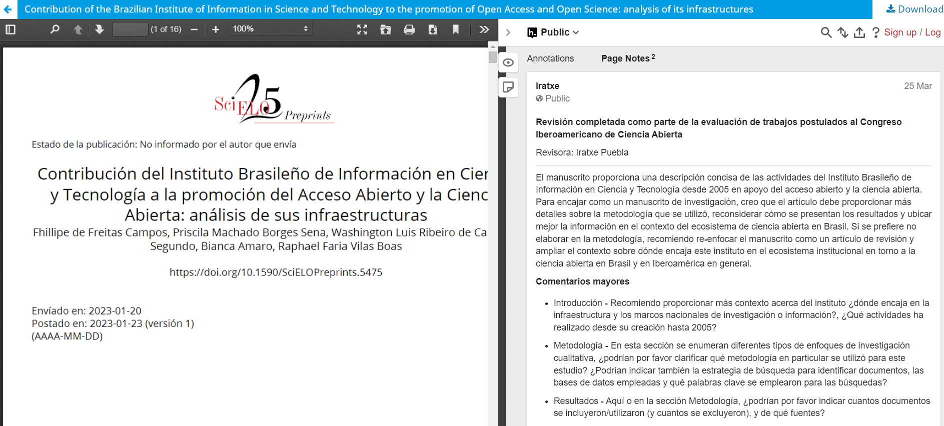 During this process, we worked closely with both the SciELO Preprints team and the editors of the partner journal to harmonize both the reviews themselves and the publication process of the reports. One thing to keep in mind was that the journal maintains an anonymized peer-review process, but the journal welcomed the idea of an open review approach complementary to its internal processes.
