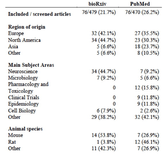 But let’s start by taking a look at the results up to now. Our first finding – and the most important caveat in interpreting the rest of them – is that random samples from bioRxiv and PubMed differ in a lot of ways. First of all, the subject areas are vastly different, as one can see from this table.