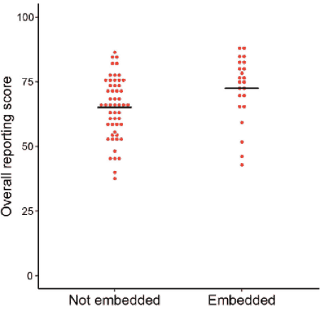 Differences in the subjective impression of evaluators on two points – whether title and abstract were clear about the study’s main findings and whether the required information was easy to find in the paper – were larger than those observed in objective reporting scores. As subjective and objective metrics were correlated, we wondered whether features related to data presentation – such as having figures at the end of the paper rather than throughout the manuscript – could have an impact on quality of reporting scores. Interestingly, an exploratory analysis revealed that preprints with figures embedded in the text – instead of aggregated at the end of the file, as happens in most cases – had reporting scores equivalent to PubMed articles.