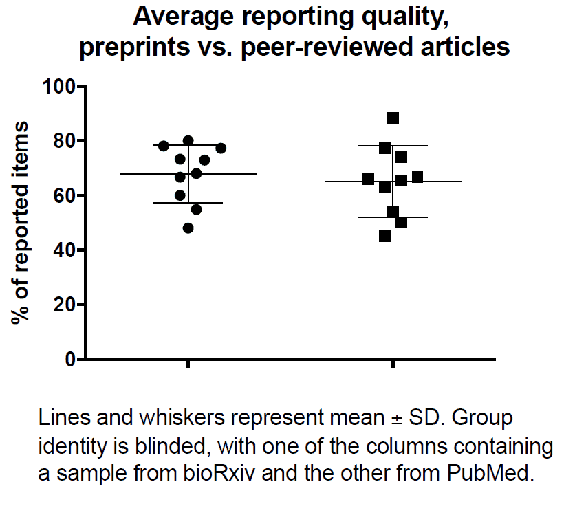 With this in mind – and very much inspired by the crowdsourcing approach used by the NPQIP and IICARUS studies, we have started a project to compare reporting quality between preprints in bioRxiv and published articles in PubMed. The comparison aims to answer two main questions: (1) whether the average preprint differs from the average peer reviewed article in terms of reporting quality and (2) whether the average reporting quality of articles changes between their preprint and published versions.