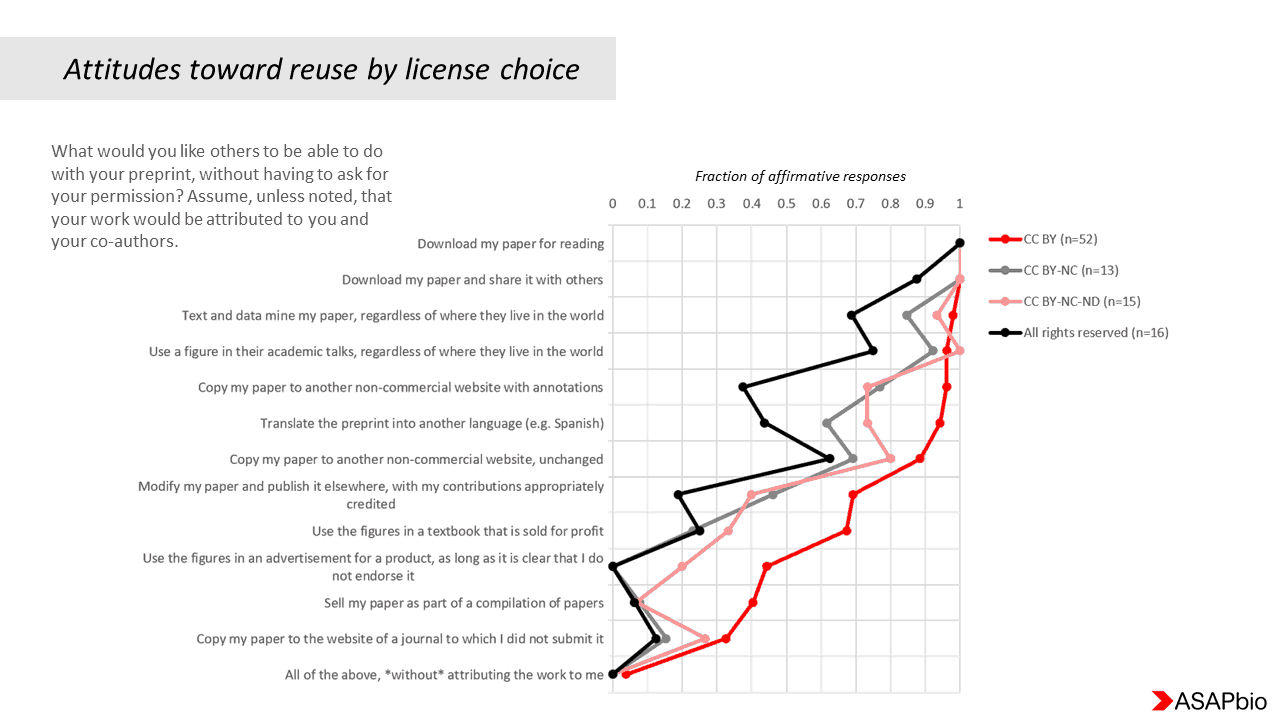The ASAPbio preprint licensing task force invited all preprint authors to take an anonymous 5-minute survey about licensing choices between February 15 and March 5, 2018. Results, ppt files, and more analysis can be found in the Github repository under a CC0 license.