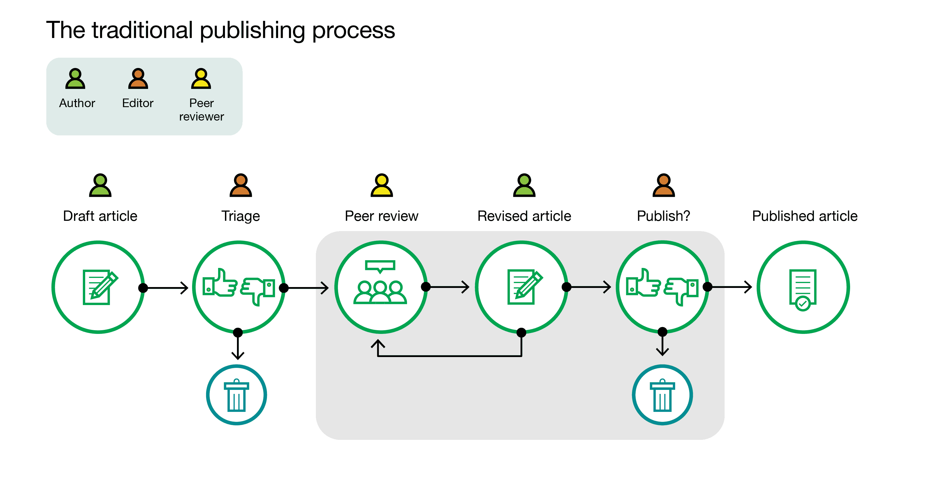 Author-driven publishing is already practiced at preprint servers and publishing platforms such as F1000Research. The difference between a publishing platform and a journal is that the author replaces the editor in all major gatekeeper roles (Fig. 1C): the submitted article is immediately published as a preprint; the author-selected peer reviewers evaluate the work; the attributed peer reviews are published together with the revised manuscript when the author decides to publish; and version control allows the author to update the manuscript (Tracz, F1000Research, 2016). All versions and all peer reviews are available under an open access license. Such articles are also indexed in PubMed, the National Institutes of Health’s searchable database of life science research articles, if at least two reviewers have signed off that the work is technically sound. Several funders, including the Wellcome Trust and the Bill & Melinda Gates Foundation, have established open research platforms based on the F1000Research model. Future experiments with publishing platform models may differ in important ways – such as how they select articles for peer review (will every submission be reviewed?) and how they select peer reviewers (should the author or an independent entity select reviewers or should peer reviewers self-select?). Publishing platforms, where authors replace editors as gatekeepers, are an exciting model for scientific publishing in the future because they provide an efficient and fully transparent completion of the research workflow and best satisfy requirements for the open sharing of research outputs.