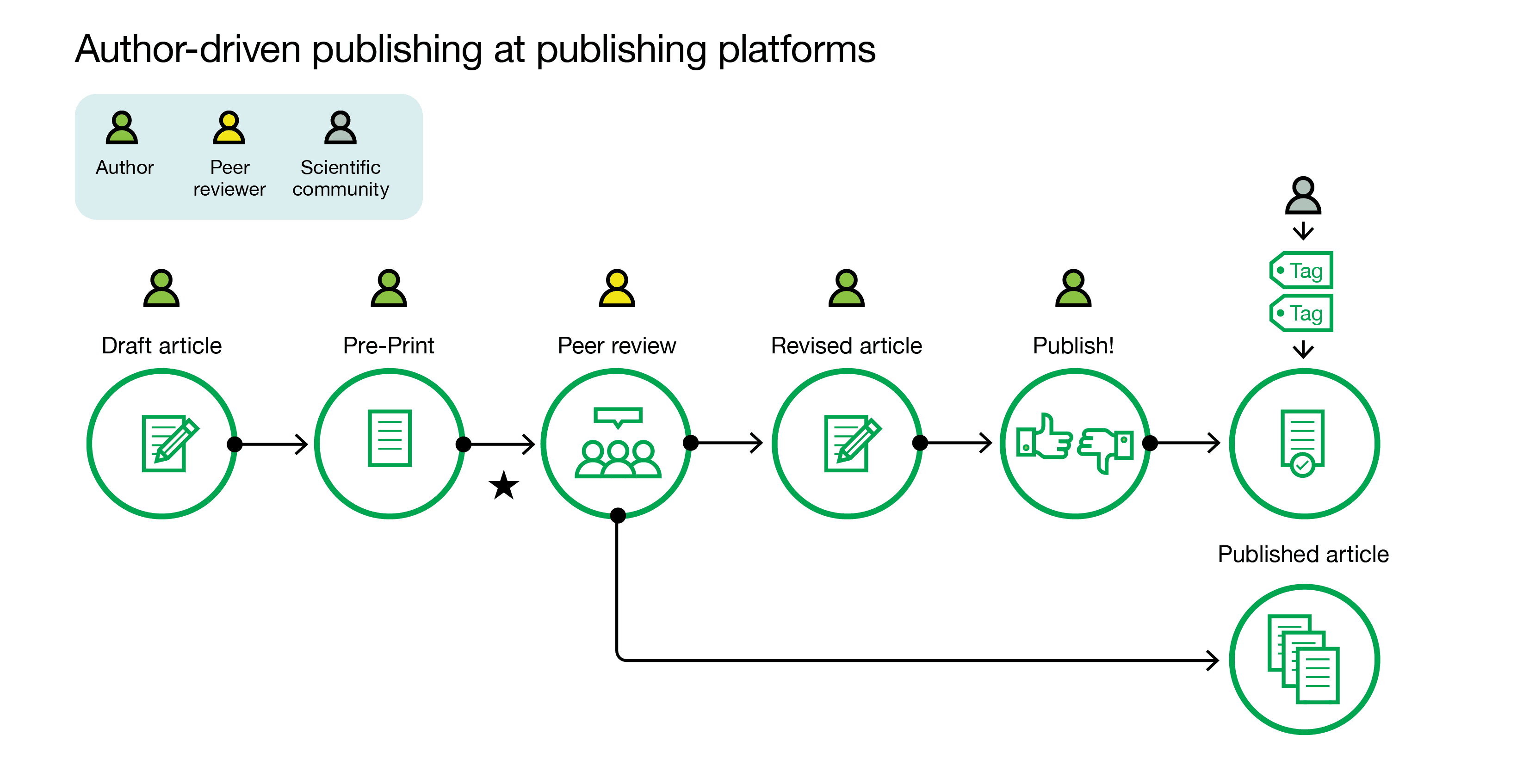 A.The traditional publishing process. Editors fulfill two critical gatekeeper functions: editorial triage and the decision to publish. The box (“black box”) signifies that the step between peer review and the publishing decision is typically confidential, making the published article the only visible outcome of the processes in this box. B. Author-driven publishing at journals. Editors still conduct editorial triage, but authors decide what and when to publish. The peer reviews are published together with the article. Tags are added by editors and other scientists to facilitate post-publication evaluation. C. Author-driven publishing on publishing platforms. The star indicates that peer reviewers can be selected in various ways: by authors, by self-selecting reviewers, or by yet-to-be-determined community approaches. As in B, peer reviews are published and tags evaluate articles post-publication. Editors are not listed for C, since they do not fulfill any gatekeeper roles, but they can contribute to post-publication evaluation.